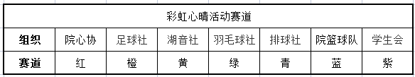 4个组织、7个赛道(1.院心协2.院篮球队3.湖音社4.:羽毛球社5.排球社6.足球社7.学生会(PS:机动赛道扎口学生会体育部,包括班级活动或学生个人运动)