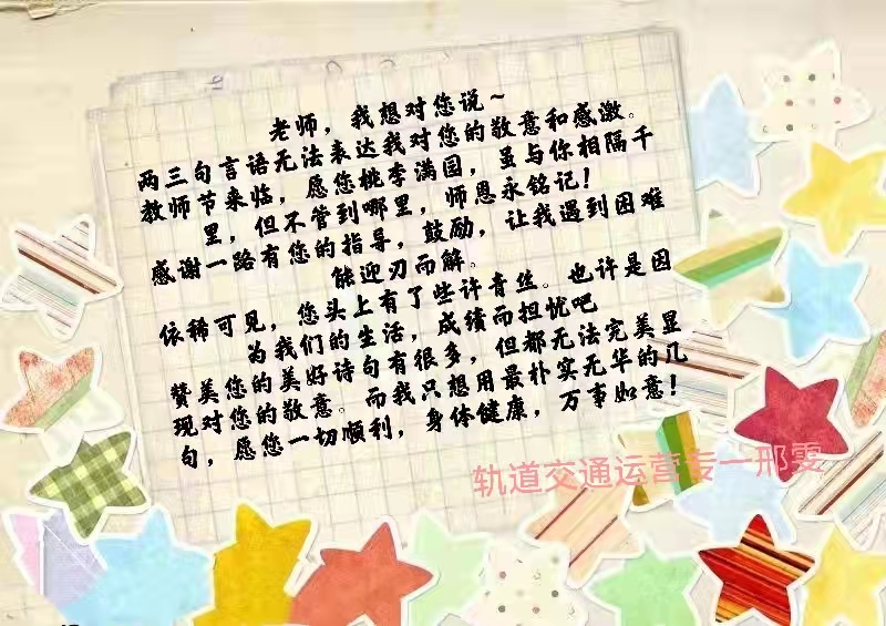 经过学院和班主任老师多方宣传,收到了学生近二十份的征文材料,内容形式丰富多彩,饱含着对老师的崇敬之意,学生把心中想说的话都倾注到笔尖,写成一份份书信或三行情诗,透过学生视角讲好师德故事,展现广大教师在教书育人、管理育人、服务育人中的典型事迹和精神风貌。“经历挫折,才知道您的良苦用心。历经风雨,才明白你的谆谆教诲”。从不同的角度热情讴歌了无私奉献、辛勤工作着的老师们。