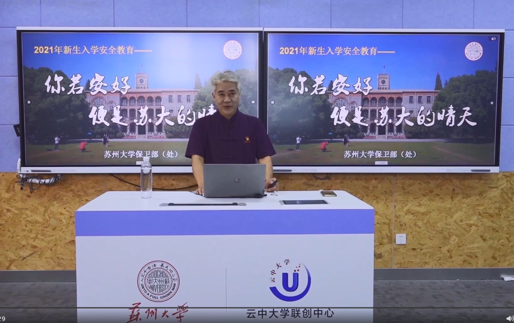 最后金院和邵主任,跟同学一起收看苏州大学保卫部(处)副调研员、政治保卫科科长周伟虎老师的《你若安好,便是苏大的晴天》新生入学教育安全讲座。