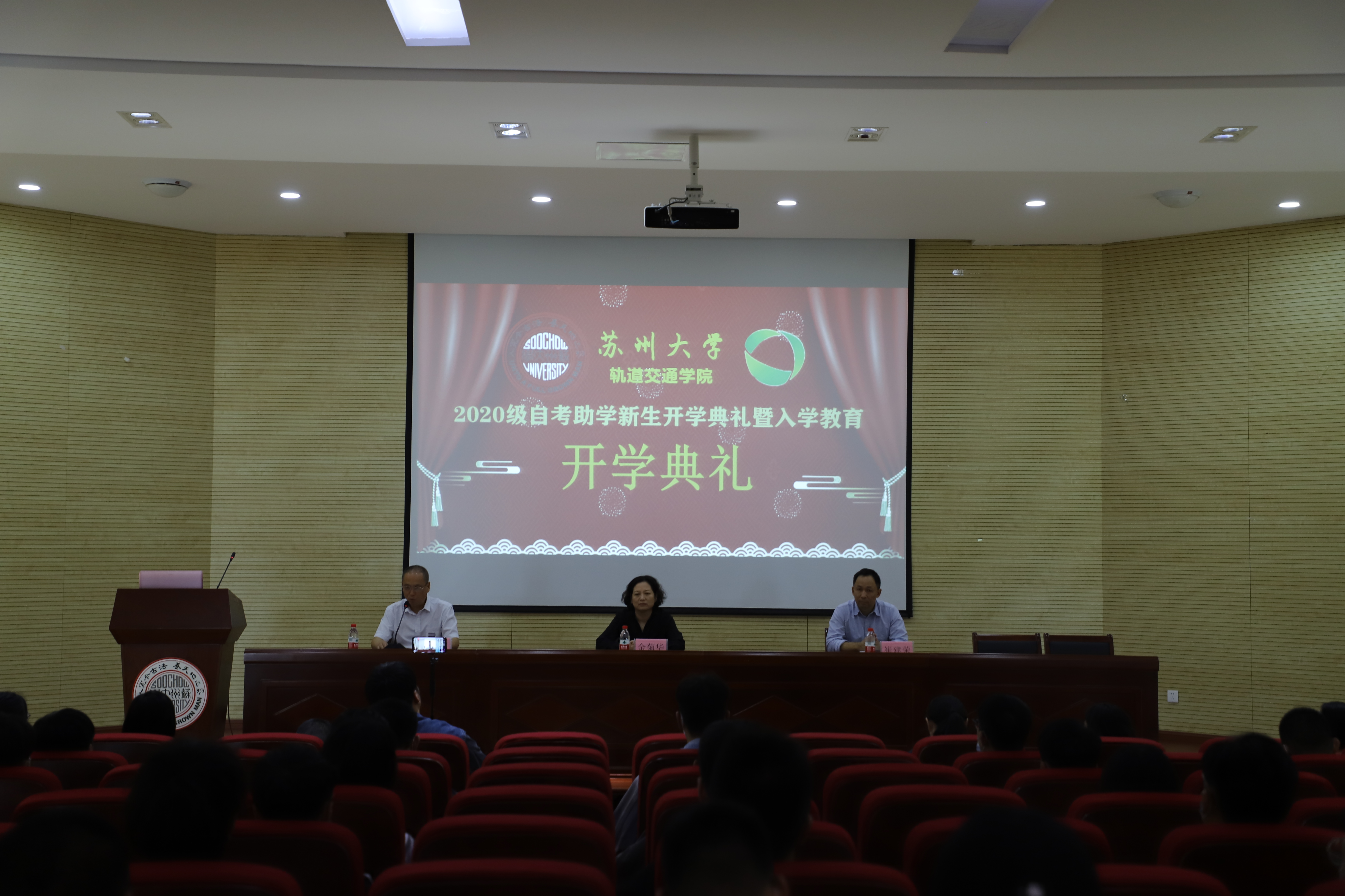 走过娇艳的烈阳,来到金秋十月。又是一年开学季,百年苏大再一次迎来了全新的面孔。10月12日上午9点30分,在轨道交通学院交通大楼报告大厅举行了新生开学典礼仪式。由于当前新冠疫情的特殊性,此次开学典礼分别采用线上线下同步进行,同学们可以足不出户观看典礼直播,不仅有效落实了防疫安全工作而且还利用了当下流行的手机直播技术,为典礼增添了些许趣味性。出席本次典礼的老师有金菊华院长、邵建国老师、崔建荣老师、周伟虎老师及全体班主任和学生代表。