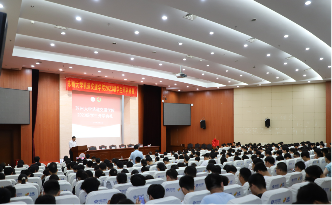9月15日上午,苏州大学轨道交通学院2023级学生开学典礼在阳澄湖校区图书馆报告厅隆重举行。院党委书记戴佩良,院长史培新,副院长金菊华、肖为周、黄伟国,各教工党支部书记、系主任及副主任、成长陪伴导师、班主任、辅导员及全体2023级学生出席仪式。典礼由院党委副书记、副院长胡洋主持。