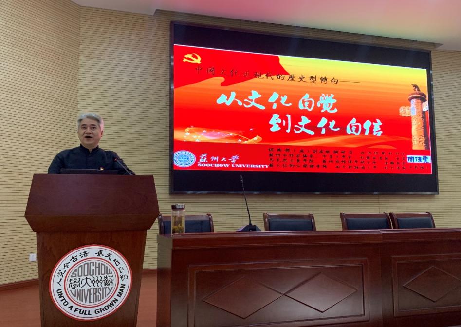 2021年4月13日下午2点半,我院特邀请苏州大学保卫处副处级调研员、政治保卫科科长,苏州市作家协会、苏州市甲骨文学会、姑苏区书法家协会会员周伟虎老师,来轨道交通学院二楼报告厅举行了一场专题名为《中国文化近现代的历史型转向——从文化自觉到文化自信》的讲座。讲座由对外合作办公室主任邵建国老师主持,我院120多名老师和同学聆听了讲座。
