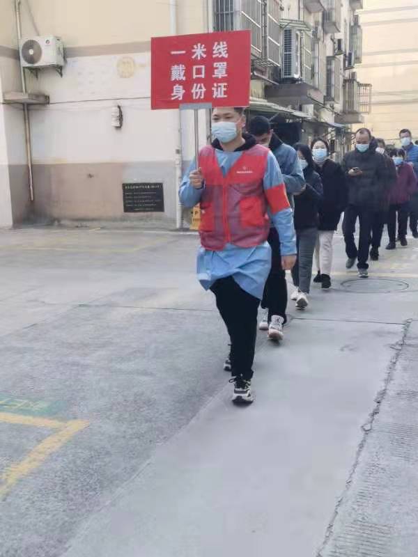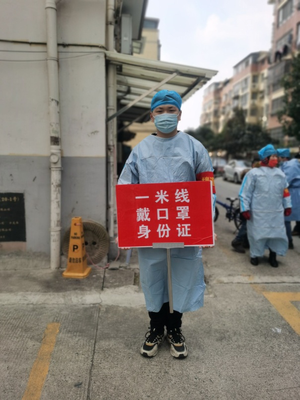 他加入了昆山市陆家镇童泾社区的核酸检测志愿者活动。主要负责为被检市民的人员信息的登记与核实工作、体温测量、健康码查验、负责维护现场秩序,引导居民前往核酸检测点进行核酸检测。有时候一站就是8个小时,从不抱怨。