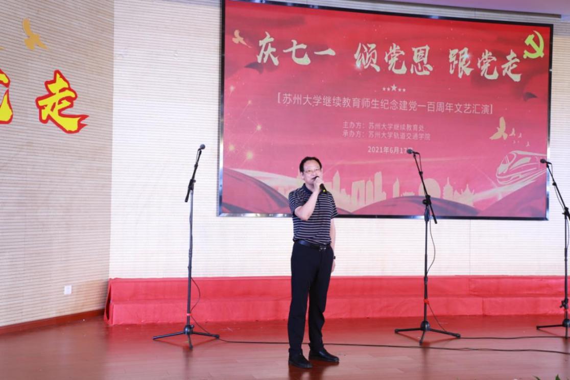 苏州大学继续教学处处长缪世林为活动致开幕辞,感谢轨道交通学院为此次活动付出的努力,鼓励学生积极参加学院组织各项活动,通过活动进一步增强民族自豪感和使命感,凝心聚力。在活动的同时也要抓紧时间进行复习,在期末考试中取得优良成绩,最后预祝活动圆满成功。随后金菊华副院长代表轨道交通学院对来参加活动的各位领导和同仁表示欢迎,希望同学在接下来的表演中,努力表现,通过以歌咏志、以歌抒情的方式,热情讴歌党的光辉业绩,以良好的精神面貌来迎接建党100周年的到来。